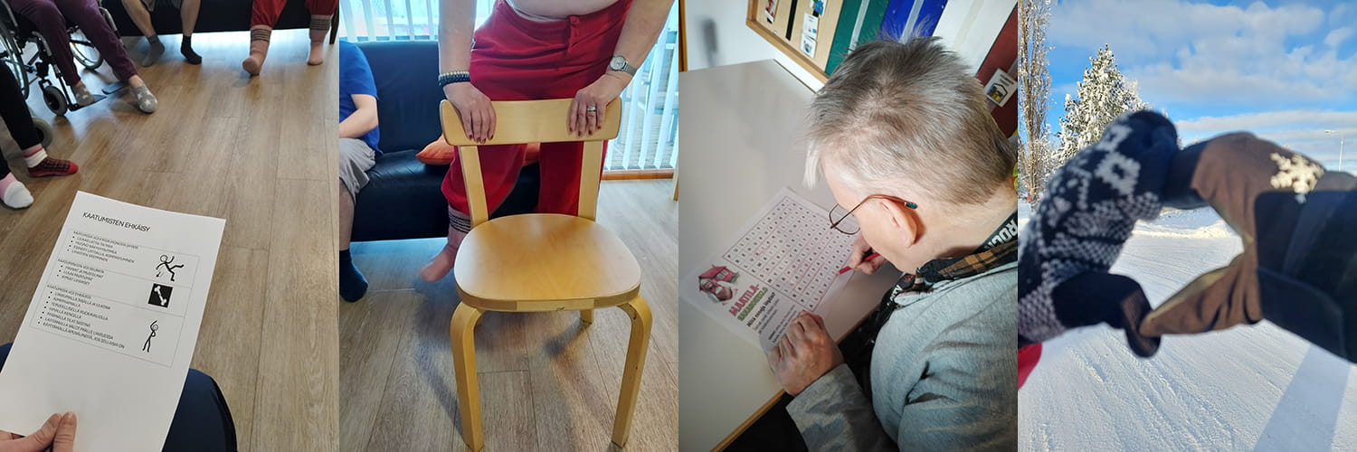 Rantakodilla kävimme yhdessä läpi keinoja kaatumisen ehkäisyyn ja keinoja löytyi monia. Teimme lopuksi yhdessä jumpan ja nimesimme sen turvajumpaksi, joka ehkäisee kaatumisia. Jumpassa oli eri vaikeustasoja ja jokainen pystyi siihen osallistumaan omien voimavarojen mukaan. Jumppa kokonaisuudessaan laitettiin seinälle nähtäväksi, joten voimme sitä aina ajoittain tehdä yhdessä.